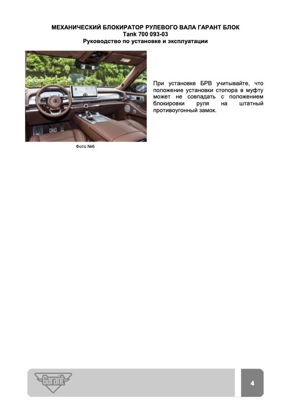 Блокиратор рулевого вала Гарант Блок Люкс 093.X/f/s для TANK 300 c 2023 г. ЭлУР - это надежный блокиратор рулевого вала, защищающий автомобиль от всех известных способов вскрытия.
