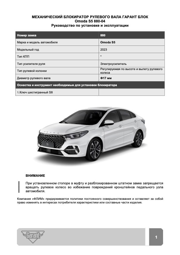 Блокиратор рулевого вала Гарант Блок Люкс 880.Х/f/k для OMODA S5 c 2023 г. РВ-ф17мм* - это надежный блокиратор рулевого вала, защищающий автомобиль от всех известных способов вскрытия.