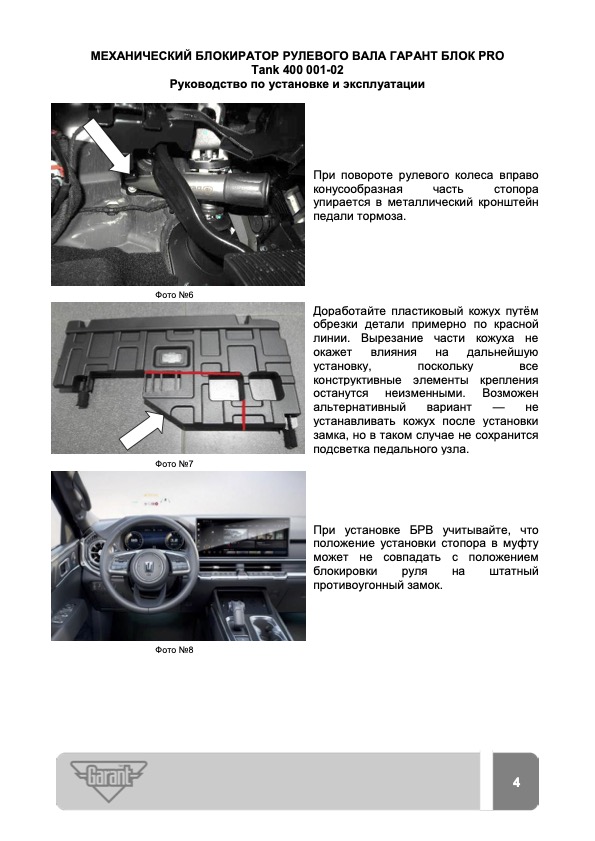 «Гарант Блок PRO» для TANK 400 c 2025 г. ЭлУР – это усиленный блокиратор рулевого вала, собравший в себе новейшие инженерные решения. Благодаря высокому уровню криминальной стойкости успешно сопротивляется всем известным механическим способам воздействия.